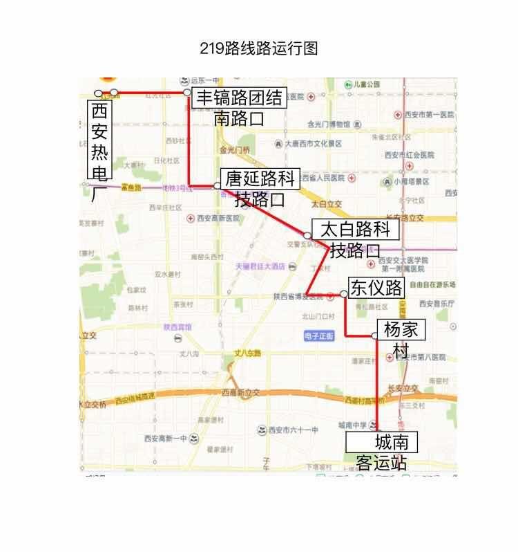 219路由热电厂发车,经红光路、丰镐西路、团结南路、科技路、吉祥路、永松路、电子正街、电子二路、东仪路、明德二路、朱雀大街南段、朱雀南路、雁环路、清凉寺北路至城南客运站。新增:丰镐路团结南路口1个站点;取消:北窑头1个站点。线路全长17.5公里,首班:6:00,城南客运站末班20:30,西郊热电厂21:00。实行无人售票投币两元可刷卡票制。