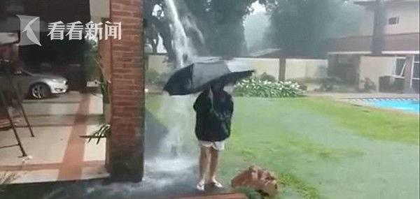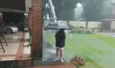 阿根廷的波萨达斯日前发作惊险一幕,一名12岁小男孩不听妈妈的劝,撑了一把伞在暴雨中玩耍。
