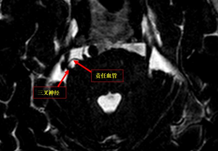 ▲术前头颅MRI:右侧三叉神经经颅内段外上缘示一较粗血管影伴行,邻近并示一小血管骑跨走行,关系密切。