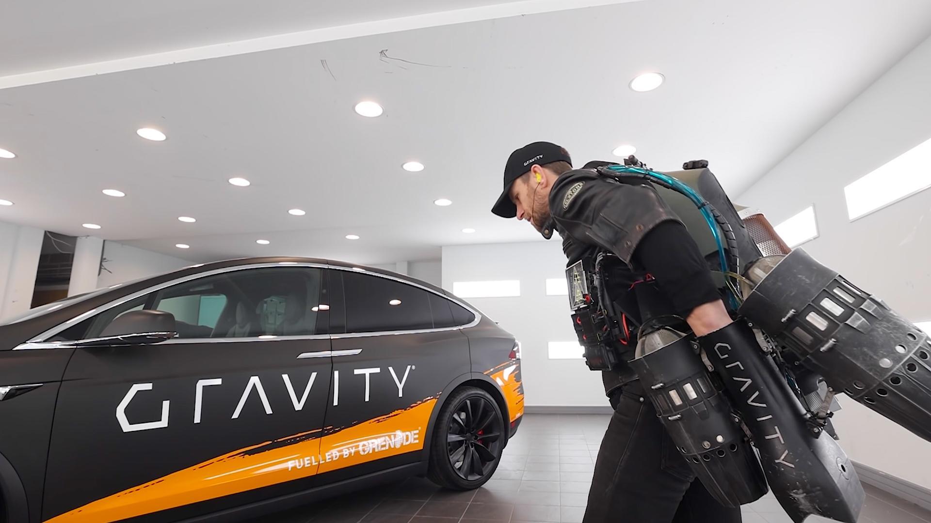 它就是英国重力工业研制的单人飞行器,我们先来看一下这件飞行器的结构,它由五个涡喷发动机为动力,分别在手臂的上下两侧,还有一个在背部,它推动的马力可达到1000匹以上,背部的燃料箱可以装下35升柴油,总重54斤,最大飞行高度可达3600米,最快速度可达51公里每小时