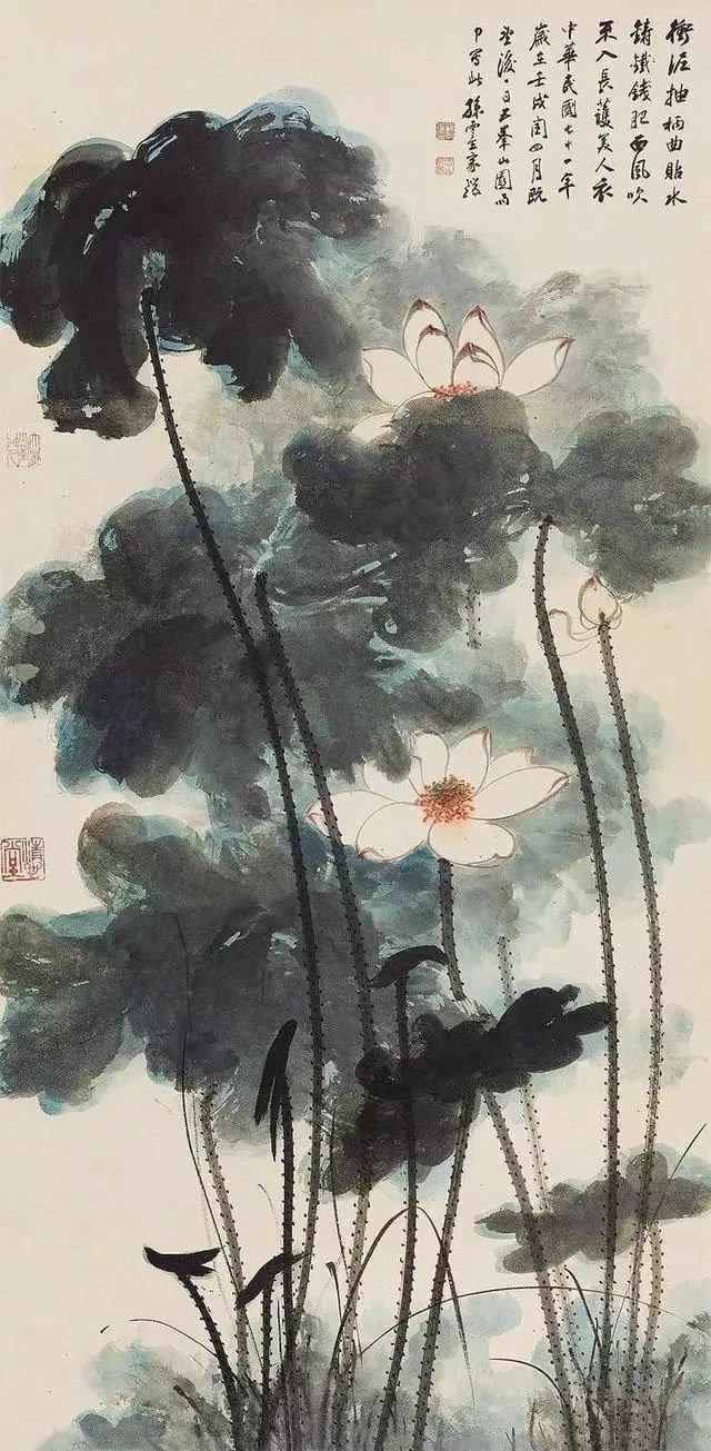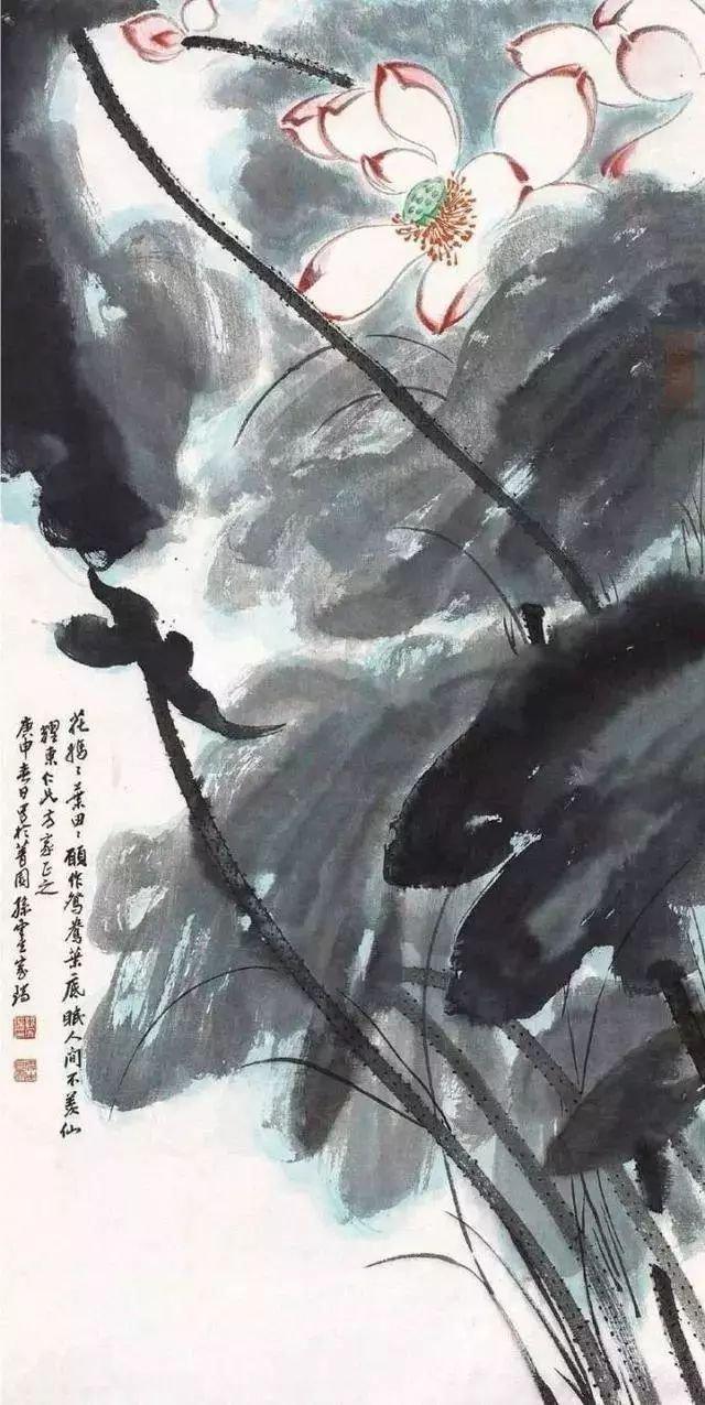 其工笔、写意、泼墨、泼彩均运用自如,书法更得大千之笔意。