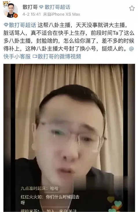散打今天发微博表示,有些八卦主播真的不适合在快手生存,前段时间封了这么多主播,怎么把你漏下了,犯人!