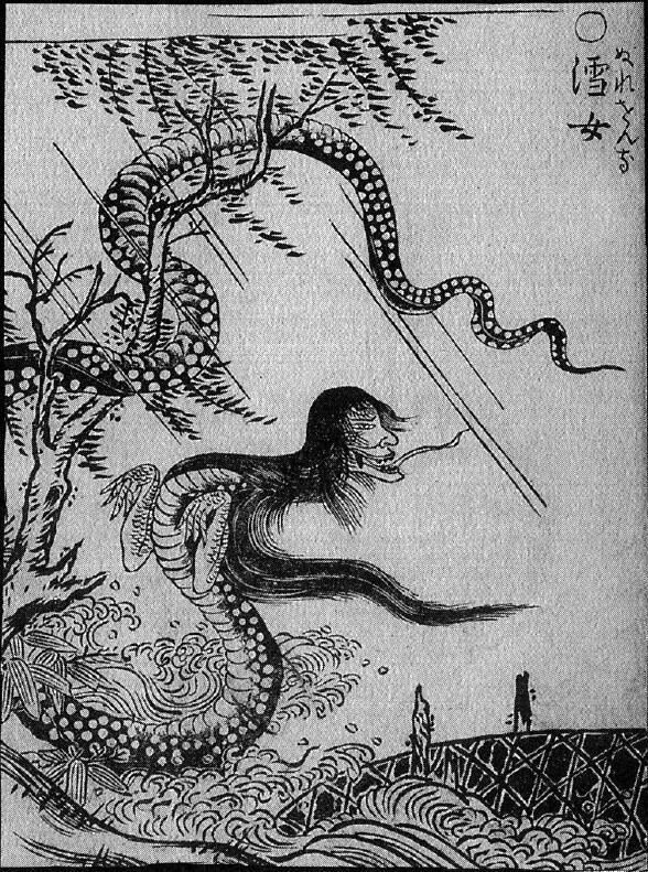 《百鬼夜行图》中描绘的濡女有着超长的尾巴,据说长度有300米多米。平日里,她坐在海边的岩石上,只露出上半部分的女身,妩媚地梳理着随风飘动的长发,倘若有人为美色所迷,接近她并搭讪的话,她就会迅速地甩出藏在水下的蛇尾,将目标缠绕住,然后露出狰狞的本相,裂开大口,发出几乎可以刺破耳膜的尖啸,嘴里吐出蛇信般分叉的舌头,一口气吸干受害人全身的血液。在鹿儿岛县,渔民之间甚至传说只要看濡女一眼,就会得病死去,其恐怖如此。以至于为了不与濡女遭遇,渔夫们在盂兰盆会、大年三十以及七月十八的晚上,都绝不出海。
