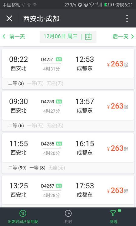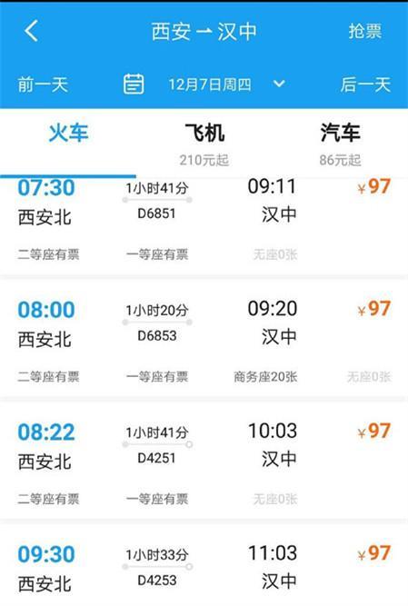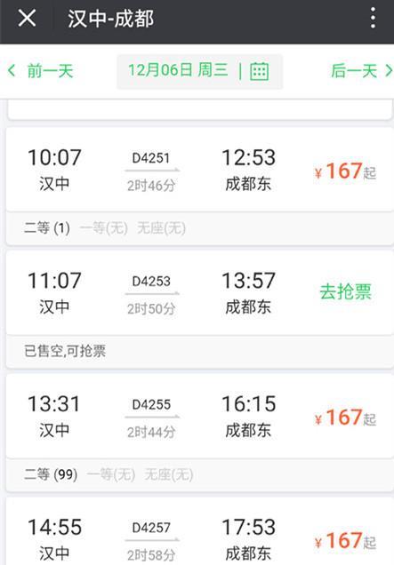 12月3日下午6时许,陕西网记者通过12306铁路网络售票系统查询发现,西安北至成都二等座263元,汉中至西安北二等座97元,汉中至成都二等座167元。