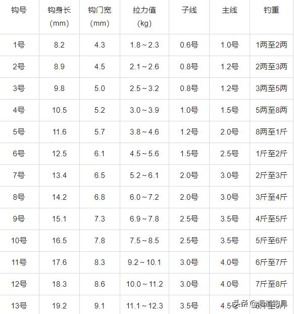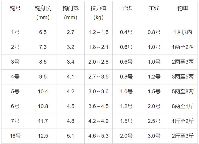鱼钩规格尺寸一览表