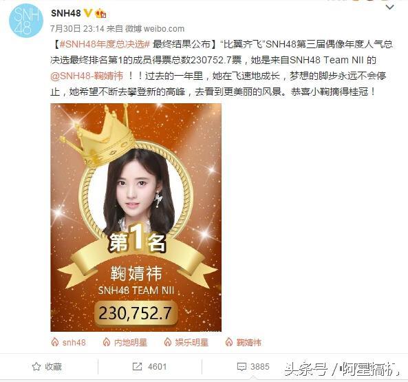 【#SNH48年度总决选# 最终结果公布】“比翼齐飞”SNH48第三届偶像年度人气总决选最终排名第1的成员得票总数230752.7票,她是来自SNH48 Team NII 的@SNH48-鞠婧祎 !!过去的一年里,她在飞速地成长,梦想的脚步永远不会停止,她希望不断去攀登新的高峰,去看到更美丽的风景。恭喜小鞠摘得桂冠!