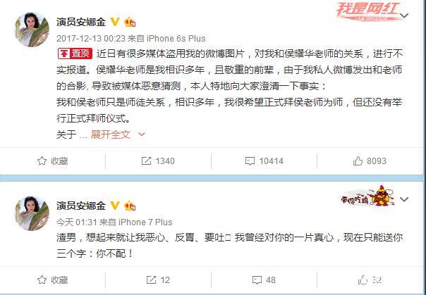 或许是不堪舆论的压力,安娜金在2017年12月13号微博上发出声明,与候耀华并无不正当关系,称只是他的徒弟,这条微博一直置顶到如今,但是今天凌晨安娜金突然在微博上发声“渣男,你不配我的真心”等等言论。