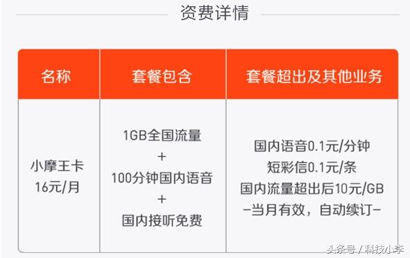 具体套餐方面,小摩王卡月租为16元,套餐内包含1G全国流量+100分钟全国语音,而在套餐外全国语音为0.1元/分钟,短彩信均为0.1元/条,全国流量为10元/GB,当月有效,自动续订。