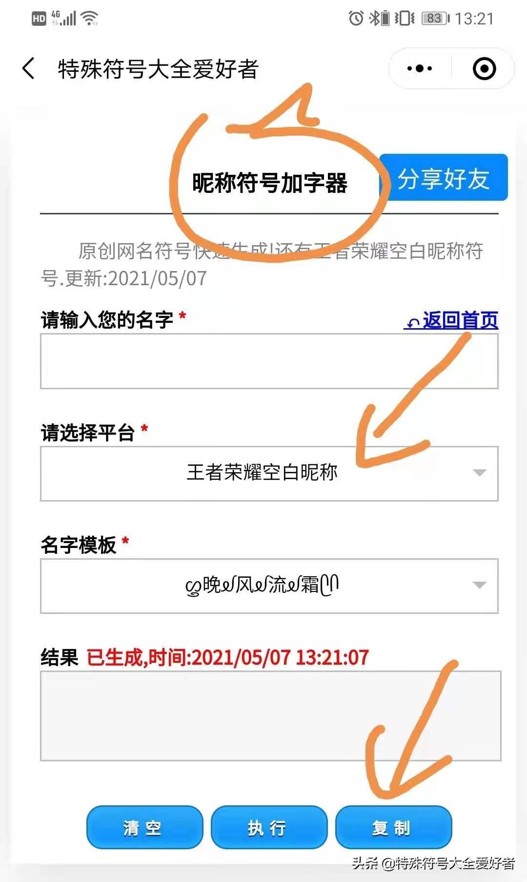 1:我们想要复制隐形符号,可以使用工具来实现,如果是在网页上面看到的空白符号,基本都是不可用的哦,不管是微信或者王者荣耀.所以我们可以使用工具来实现,我们使用微信特殊符号大全爱好者,里面有一个昵称符号加字器,通过这个工具就可以实现了