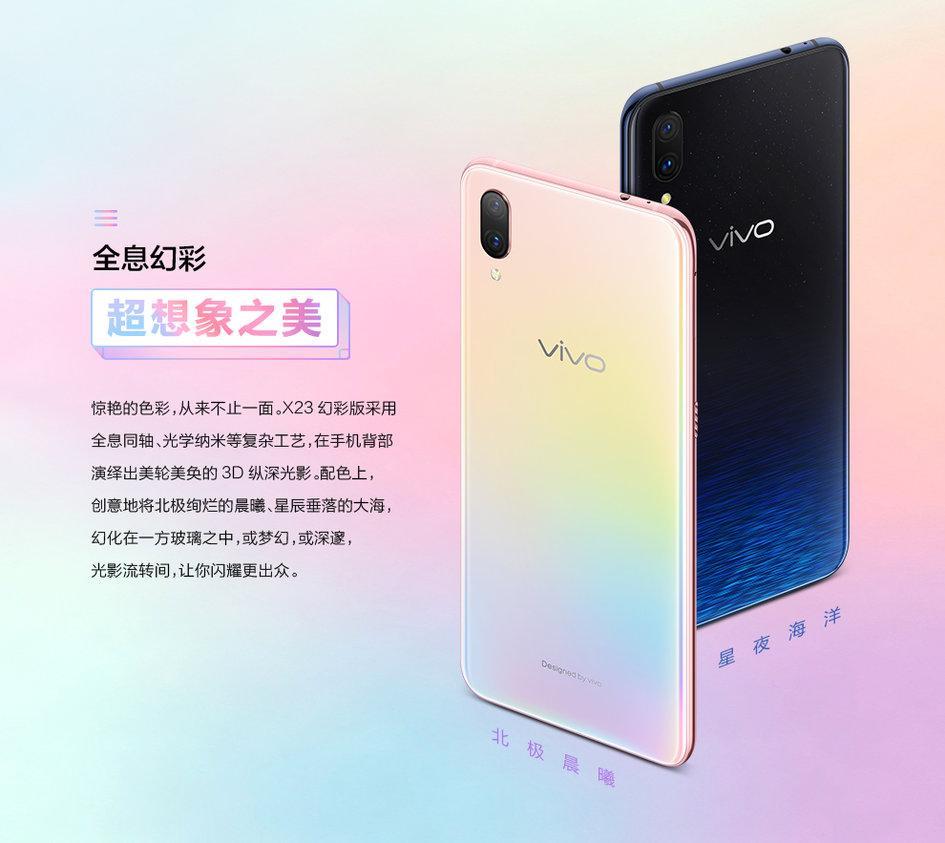 vivo X23 继推出星芒版后,官方再次推出幻彩版,拥有北极晨曦、星夜海洋两种配色。