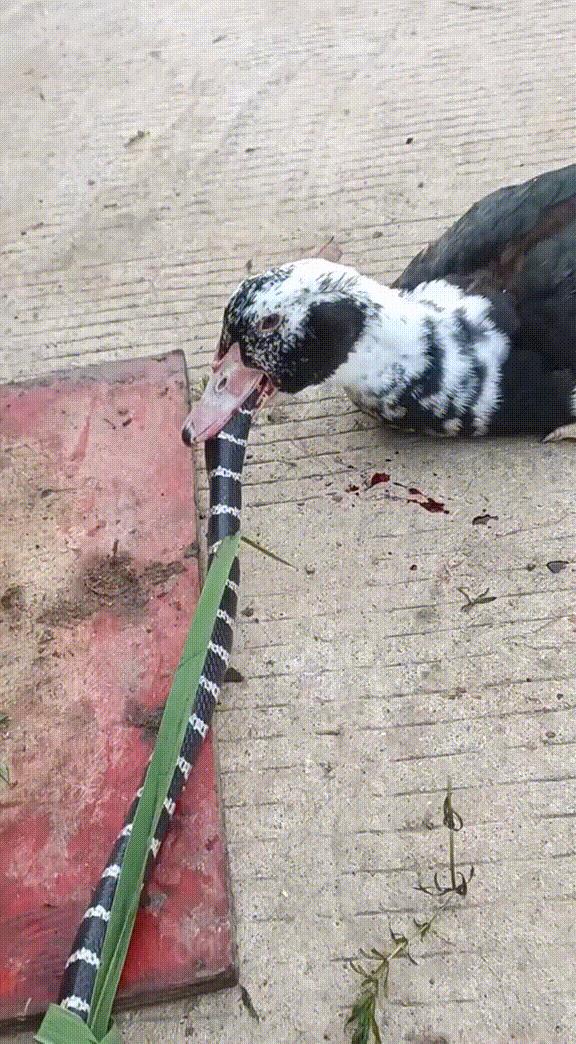 这是鸭子居然把银环蛇当成辣条吃,不得不佩服它的勇气