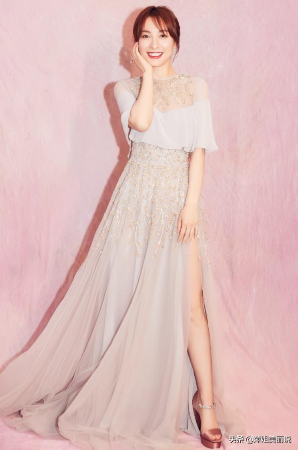 这是吴昕某一次参加活动时的造型,礼服的颜色不出挑,但款式却很适合吴昕,淡雅的颜色也可以将吴昕的气质衬得更温柔, 平时她给人的感觉有点傻傻的,但看到此时穿上藕粉色礼服的她,却觉得又仙又典雅。这款裙子裙摆表面有一层拖地的薄纱,增加开叉设计之后,裙子能穿出更性感的效果,配恨天高,她整个人看起来将近170了,这拍摄角度也刚刚好。