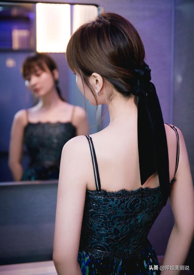 看来吴昕更适合这种在镜子中只露出一半身体的拍照方式,身穿吊带裙,背影精致撩人,肤色白皙,与深色吊带裙形成了比较冷艳优雅的视觉感。