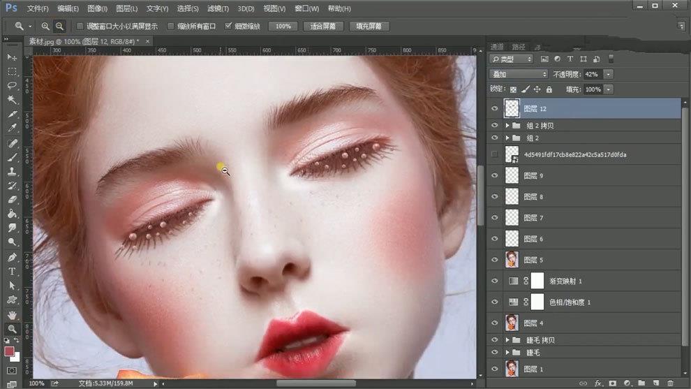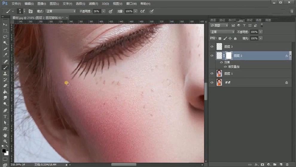 21、【Ctrl+shift+N】新建图层,使用【画笔工具】添加眼影,混合模式选择正片叠底,改变不透明度。