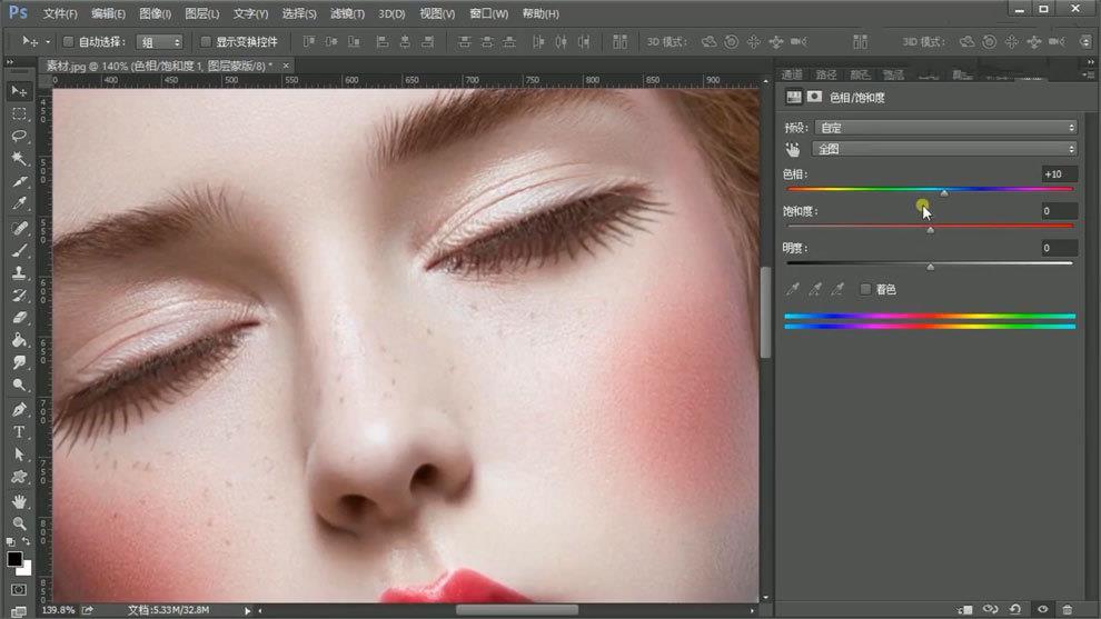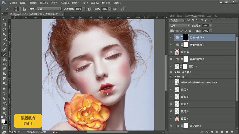 25、使用【色相饱和度】进行调整,【Ctrl+I】蒙版反向,使用【画笔工具】对嘴唇进行涂抹。