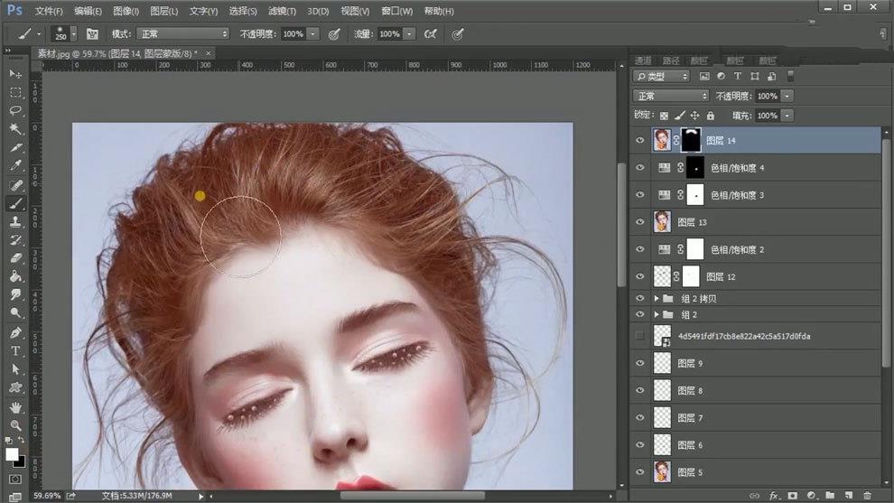 27、【Ctrl+I】蒙版反向,使用【画笔工具】对头发进行涂抹。