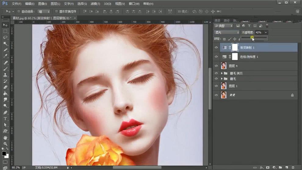 11、添加从粉色到白色的渐变映射,混合模式选择柔光,调整不透明度。