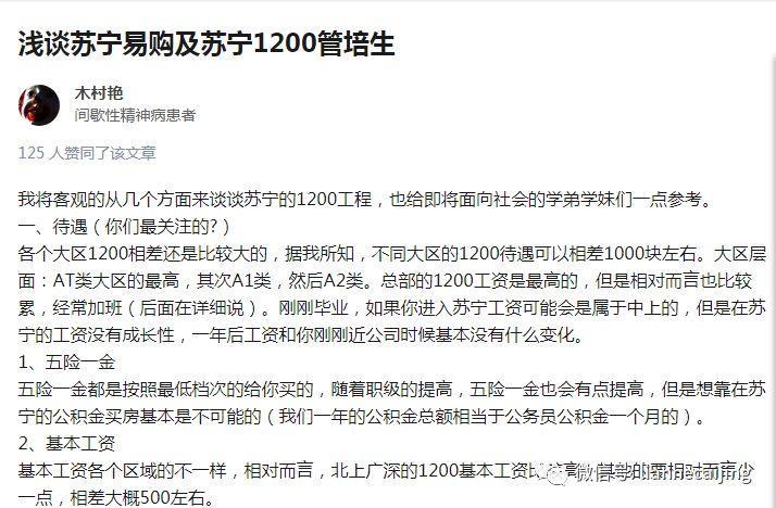 在知乎上,有一网名叫“木村艳”、标注为间歇性精神病患者的网友发布了一篇《浅谈苏宁易购及苏宁1200管培生》的文章