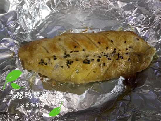 第五步:把一个鸡蛋打成蛋液,在上下两层都刷上一层蛋液,尤其是上面的表层,多刷一点,然后撒上一些黑芝麻,放入空气炸锅或是烤箱,或是微波炉,都可以