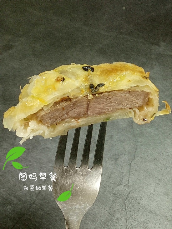第七步:出锅摆盘~外面是手抓饼的酥脆口感和蛋香,里面有牛排的嚼劲和韧劲,好吃极了~