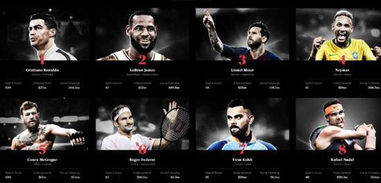 葡萄牙足球巨星C罗高居榜首,他的网络被搜索得分100分,社交媒体粉丝数达到3.44亿,而湖人队当家球星勒布朗-詹姆斯排名第二,他过去一年的代言收入5200万美元,社交媒体粉丝数1.09亿。