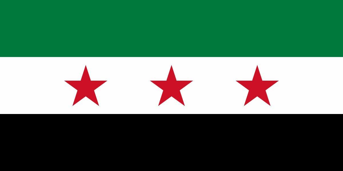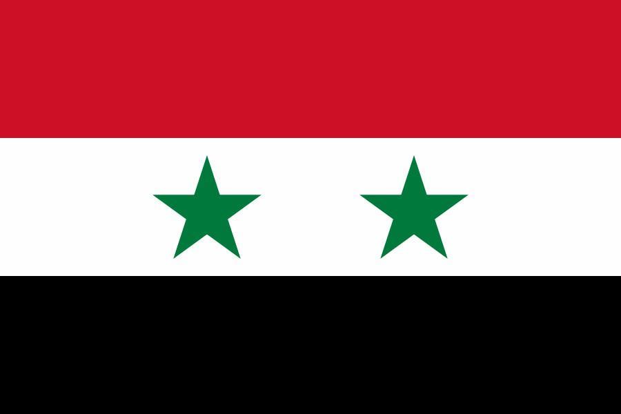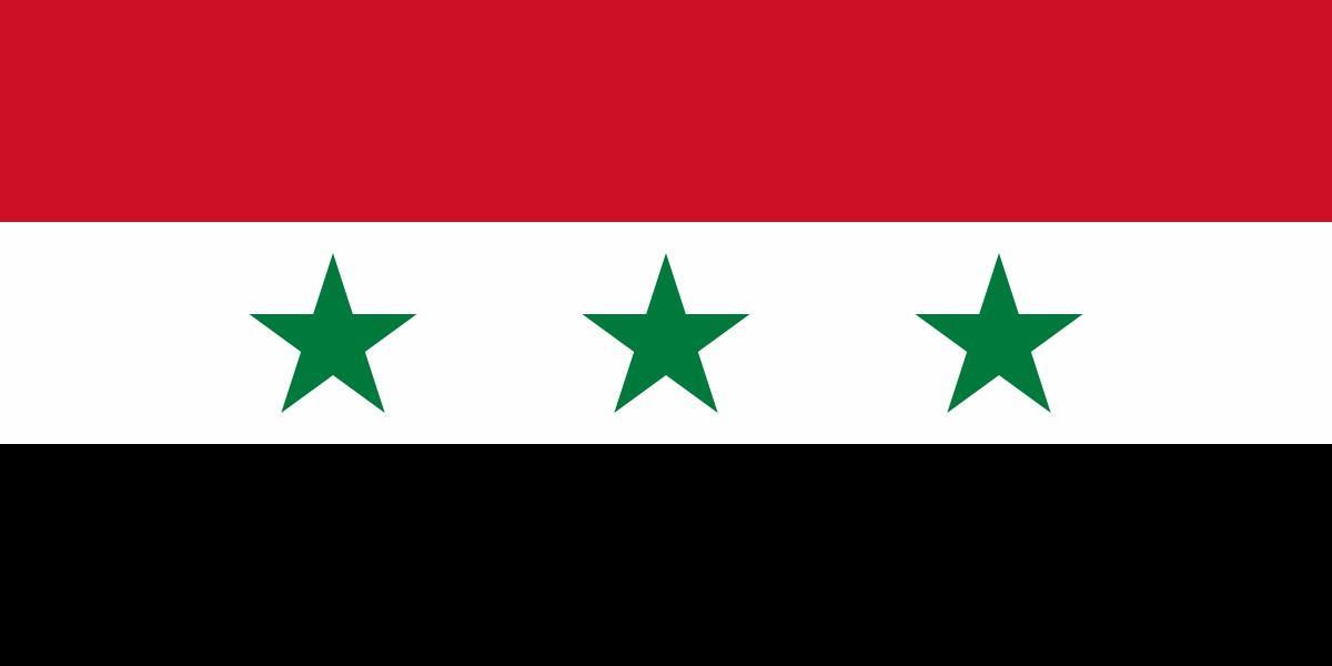 叙利亚国旗自上而下由红、白、黑三个平行长方形组成,中间有两颗绿色五角星。红色象征勇敢,白色象征纯洁和宽宏大量,黑色象征穆罕默德的胜利,五角星象征革命,绿色是穆罕默德的子孙所喜爱的颜色,本国旗曾经是联合阿拉伯共和国的国旗。(反正中东的国旗大多类似,绿白红黑四色,加星星或者月亮或者都加,再写一句清真言)