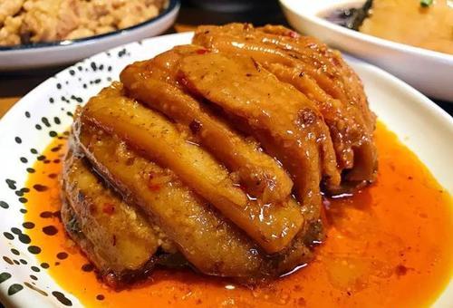 (5)用鸡汤、酱油调成汁,倒入肉碗内,上笼屉猪五花肉洗净,下沸水锅煮至七成熟取出,沥干水,用酱油15克涂匀肉皮,晾干。炒锅置中火,下入熟猪油,烧至八成热,将五花肉下锅,炸至肉皮起泡并呈红棕色时,倒在漏勺沥去油,然后切成3厘米长、1厘米宽的肉片。用旺火蒸40分钟。
