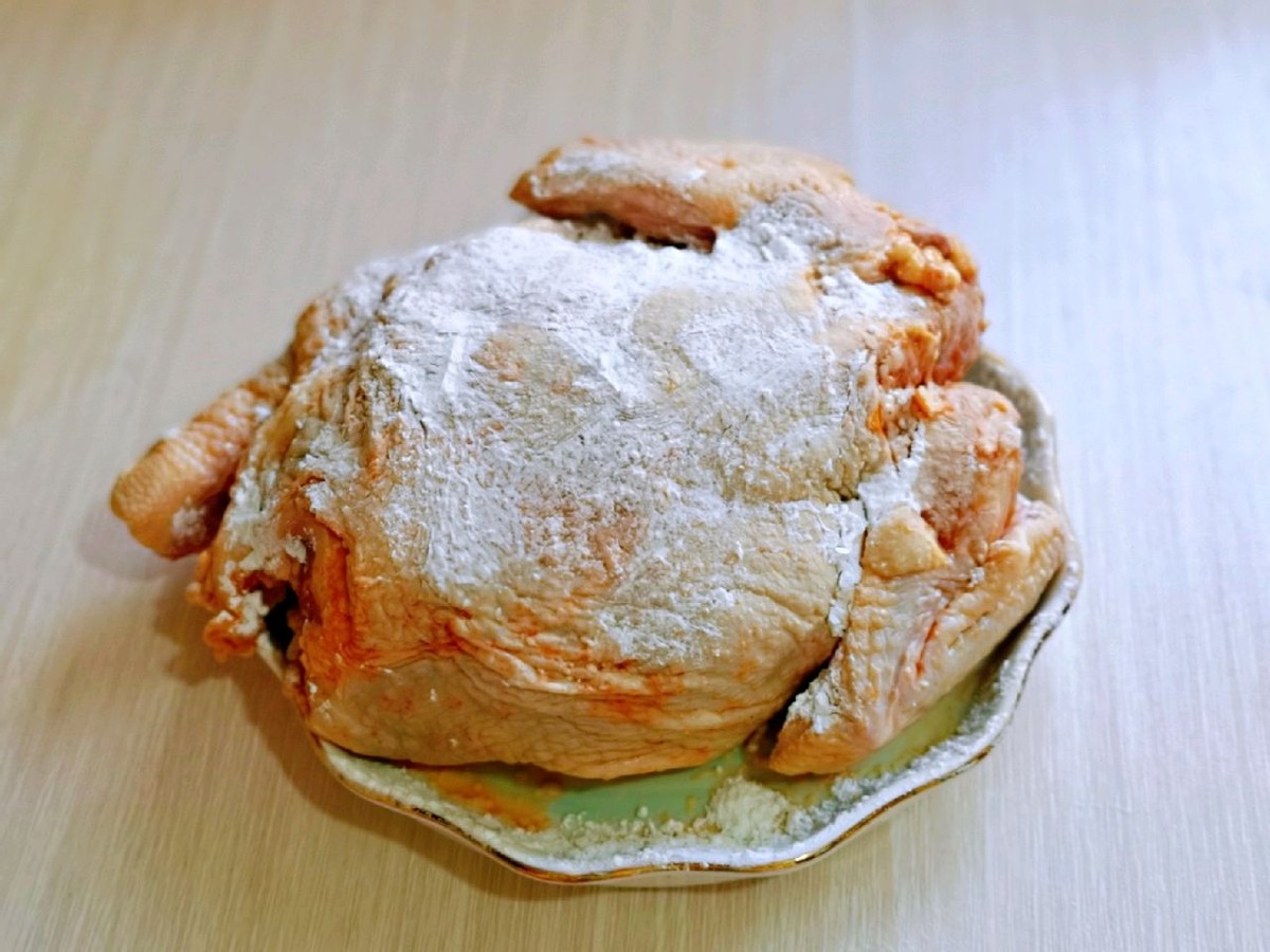 3、腌制好的鸡可以取出来,用剪刀剪去鸡爪和鸡头,均匀地涂上玉米淀粉。因为鸡爪和鸡头很容易烤焦,加上这两个部分没有太多的食用价值,所以,大家可以扔掉。