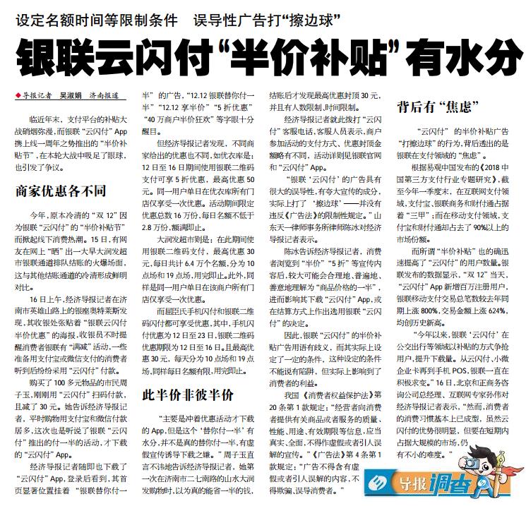 而就在云闪付双十二活动结束后,12月17日的经济导报也发文向云闪付开炮。记者认为,云闪付的活动设定名额时间等限制条件,误导性广告有打擦边球嫌疑,并且表示“半价补贴”有很大的水分。