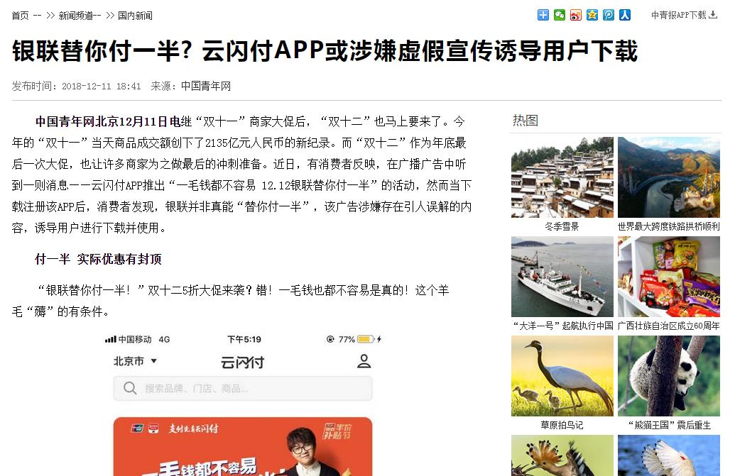 在刚过去不久的双十二活动中,不仅众多商家拿出诚意大促销,部分支付平台也参与了进来,而号称“每逢佳节打五折”的云闪付在今年双十二期间再次开启“银联替你付一半”的口号。但似乎有不少媒体对此并不买账,中国青年网在12月11日发布了一篇文章,标题直指云闪付涉嫌虚假宣传。
