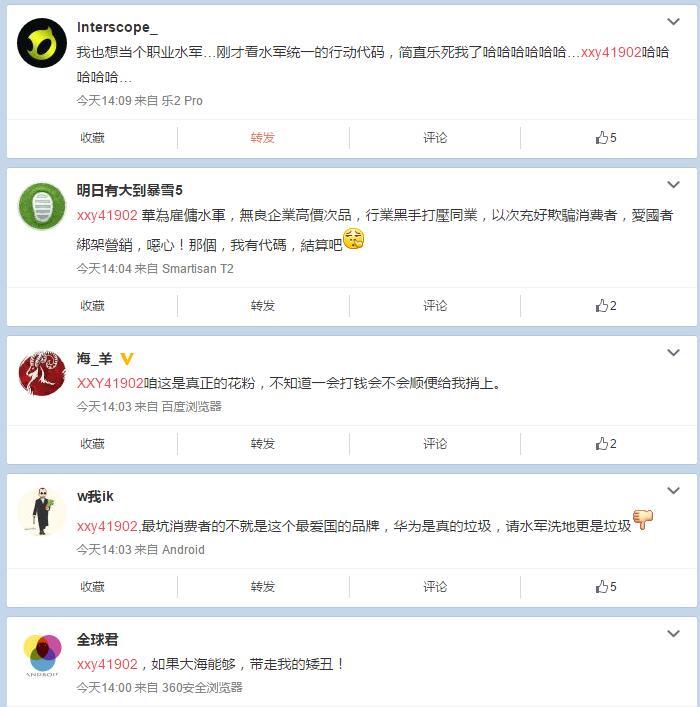 余承东回应华为P10闪存门事件后,其微博评论下出现了大量加V用户评论,基本上都是帮华为讲好话!这些评论点赞数非常的高,已然上了热门占据主要位置!不过,有网友发现了这些评论的微博里都会出现秘密代码XXY41902,该代码迅速爆红网络!