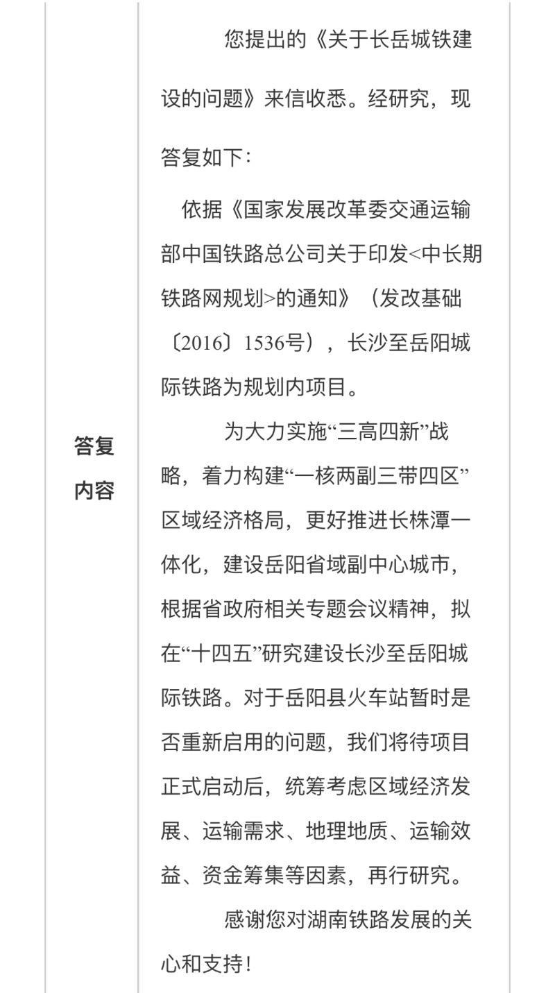 省发改委在回复中提到,为大力实施“三高四新”战略,着力构建“一核两副三带四区”区域经济格局,更好推进长株潭一体化,建设岳阳省域副中心城市,根据省政府相关专题会议精神,拟在“十四五”研究建设长沙至岳阳城际铁路。对于岳阳县火车站暂时是否重新启用的问题,将待项目正式启动后,统筹考虑区域经济发展、运输需求、地理地质、运输效益、资金筹集等因素,再行研究。