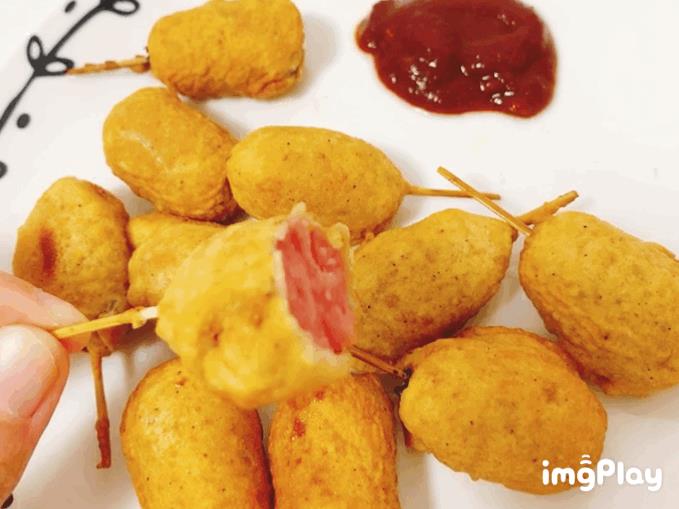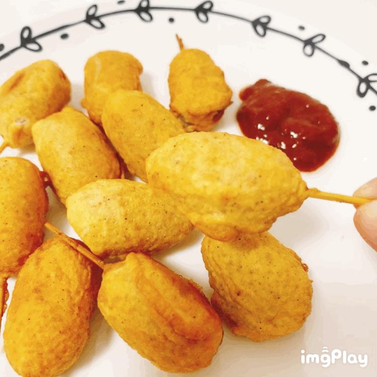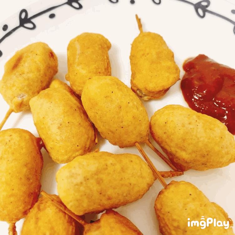 一口一串的香炸小热狗,吃起来超过瘾[吃瓜]材料也是家里都有的[嘻嘻]做起来也很方便
