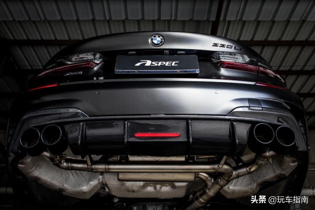 以下这辆宝马330Li,车主选择的就是ASPEC智能阀门全段排气,左右共4出的设计搭配ASPEC碳纤维排气尾嘴,看起来颇有高性能车的风范。