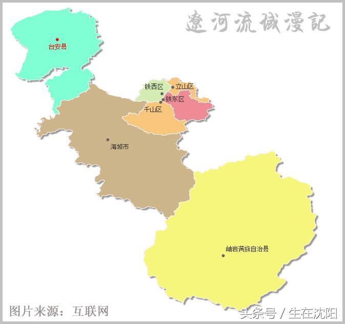 鞍山市,下辖:铁东区、铁西区、立山区、千山区、海城市、台安县、岫岩满族自治县。