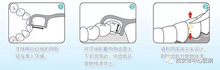 2、仔细刷牙,使用牙线,保持良好的日常口腔卫生习惯。应保持每天早晚两次刷牙,每次刷牙时间维持在2分钟左右,建议采用巴氏刷牙法或使用合格的电动牙刷。建议每天使用牙线清洁牙齿缝隙,牙线的使用方法如下图