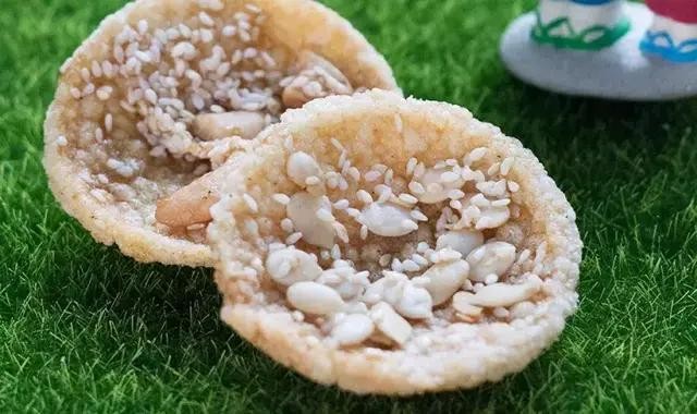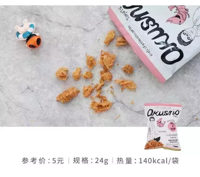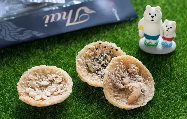 初次见面,觉得这米饼看起来很坚挺的样子,肯定很硬很难啃,但入口的时候却是意外的松脆,很轻松就咬开了,害得本花用力过度、差点咬着自己的舌头。口感有点像龙虾片,很轻盈,味道是很香的锅巴味,调味偏甜辣,因为面儿上铺满的芝麻和坚果,因此甜辣中还带着坚果特有的香气和芝麻的醇苦,唯一的缺点就是略有点油腻,吃一片还挺饱腹的。感觉泰国人在处理大米做的零食上,还是挺有一手的。