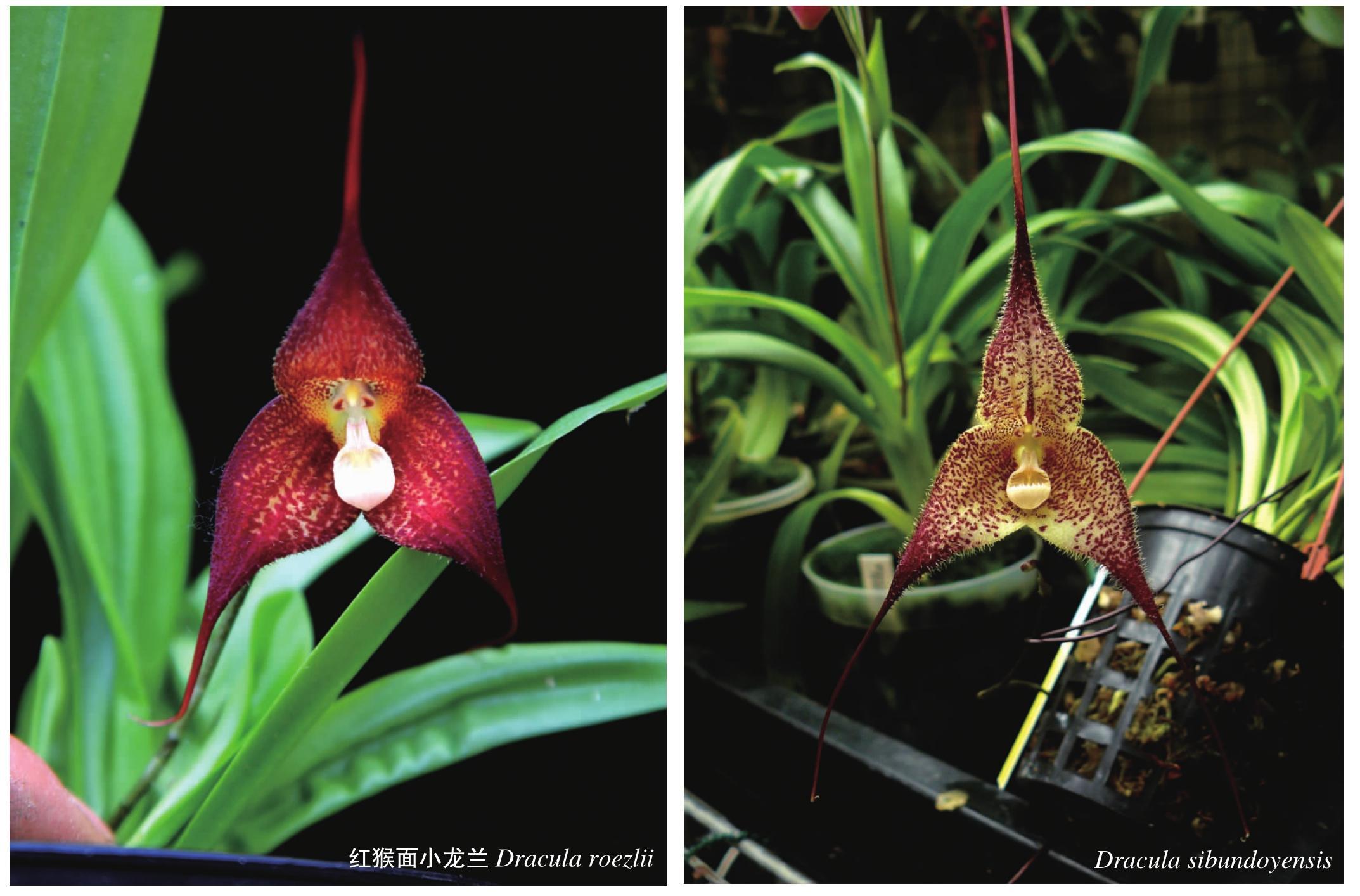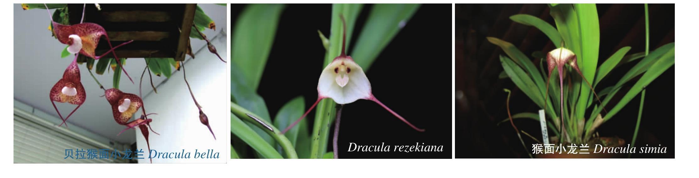 猴面小龙兰为兰科猴面小龙兰属(Dracula)多年生附生草本,株高30~40厘米,单茎单叶直立,有短小的匍匐茎,但无假鳞茎。叶带状或椭圆形,质薄,长25厘米。单花或总状花序,着生于茎的基部,长18~20厘米,花朵下垂,具一朵或多朵花,花大,竖径10~30厘米。萼片为花朵最突出的部分,中萼片直立,两侧萼片基部不同程度地结合在一起呈扁片或杯形,3个萼片先端均匀分别收缩伸展呈细尾状,尾部长可达20厘米,萼片常有茸毛。两枚花瓣短而厚,较小,先端各有一个疣状突起,分别于蕊柱两侧位于唇的上方,犹如两支眼睛。唇具膨大的褶片或脊。花色丰富,有白、红、橙红、紫、黄等,多为复色。花期春、夏季,或秋、冬季,而且更有种类不同种四季均有花期,其散发的气味与成熟的橘子或蘑菇味类似。