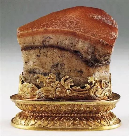 东坡肉形石出自内蒙阿拉善左旗,清康熙时供入内府。这块清代的肉形石,是一块天然的石头,色峰纹理全是天然形成的。这是玛瑙类矿物在大自然中,由于经过漫长岁月的累积,在不同的时间点,杂质影响乃至生成的颜色不同,呈现一层一层不同的色泽,制作此件肉形石的工匠,将原来质感丰富的石材加工琢磨,并将表面的石皮染色,做成了这件逼真的作品。
