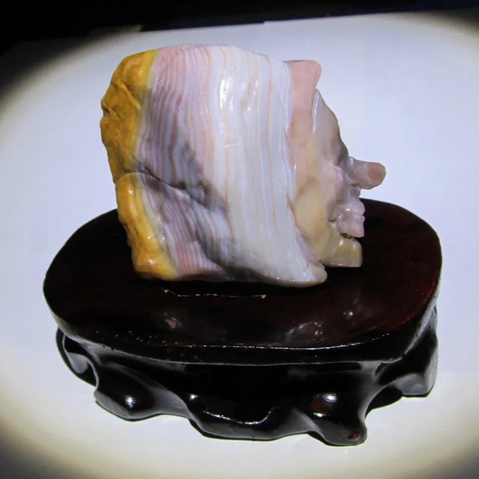 象形肉石又称风霜老人肉石,产自内蒙古自治区阿拉善地区,系纯天然玛瑙质肉石,重约260克,7.5*6*4.5cm(长宽高)造型生动逼真,该石肉皮成红黄色似酱肉,瘦肉肥肉相间。此石纯天然形成于内蒙古戈壁滩,巧夺天工。咋一看没有熏肉、肘子的肉质逼真,但却独具一格:为肉石中不多的人物象形玛瑙质肉石。
