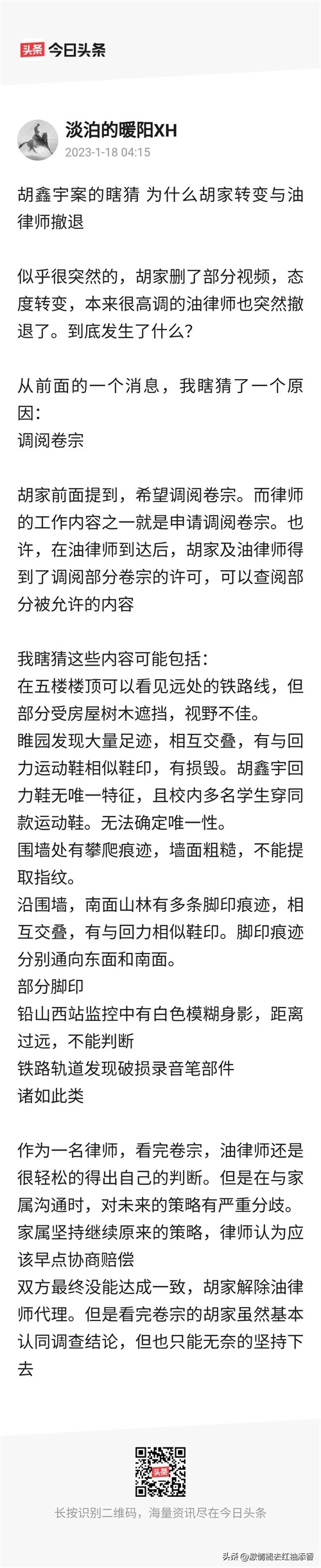 胡鑫宇失踪案最新进展,本来很高调的游律师也突然撤退了。到底发生了什么?网友猜测因为看到了调阅的卷宗,先不说此种猜测的真伪性如何,这个问题放在最后再进行分析。胡家前面提到,希望调阅卷宗,而律师的工作内容之一就是申请调阅卷宗。也许,胡家及游律师得到了调阅部分卷宗,可以查阅部分允许的内容。我瞎猜这些内容可能包括:在五楼楼顶可以看见的铁路线,更正一下不是五楼楼顶啊,而是五楼的阳台处。但部分房屋树木遮挡,视野不佳。其实这种猜测感觉有种违背客观事实,胡家人完全可能已经在寻找胡鑫宇的时候,去过男生宿舍五楼阳台实地探查过。应该早就有这方面的实际探查,可以宿舍5楼阳台应该说算是很高的了。俗话说得好:“登高远眺视野开阔”啊,再说致远中学后山大概率是树林和山岗。胡鑫宇在宿舍楼5楼阳台,大概率不应该受到任何物体遮挡,而受到视野不佳的影响。睢园发现大量足迹,相互交替,有与回力运动鞋相似鞋印,有损毁。早就发文声明过,胡鑫宇失踪当晚好几千人进入失踪现场(睢园),寻找胡鑫宇的下落。有关部分根本不可能提取到胡鑫宇的任何鞋印了,因为几千人反复踩踏,再说普通人肯定是没有保护现场的意识。再说也不符合失踪案的客观实际,更别说能分别出哪种鞋留下,哪种鞋的应有鞋痕了。