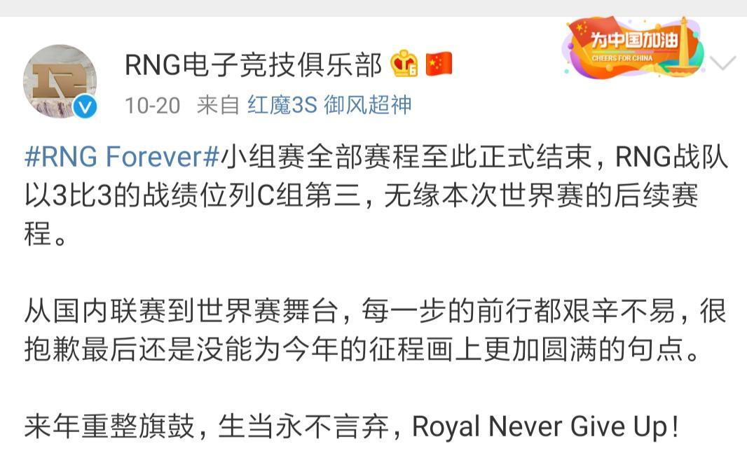 随着英雄联盟S9全球总决赛小组赛的告一段落,RNG遗憾结束了自己的本次世界赛旅程,以3比3的战绩位列C组第三,无缘后续的世界赛。10月20日是个无比伤痛的日子,RNG在这个日子有过太多的辛酸,同样是去年的这一天,RNG以八强的成绩,止步S8世界赛征程,那本是RNG最有希望夺冠的一年,无数人都期待着召唤师峡谷那场金色的雨,但是这场雨直到今天也没有下下来。