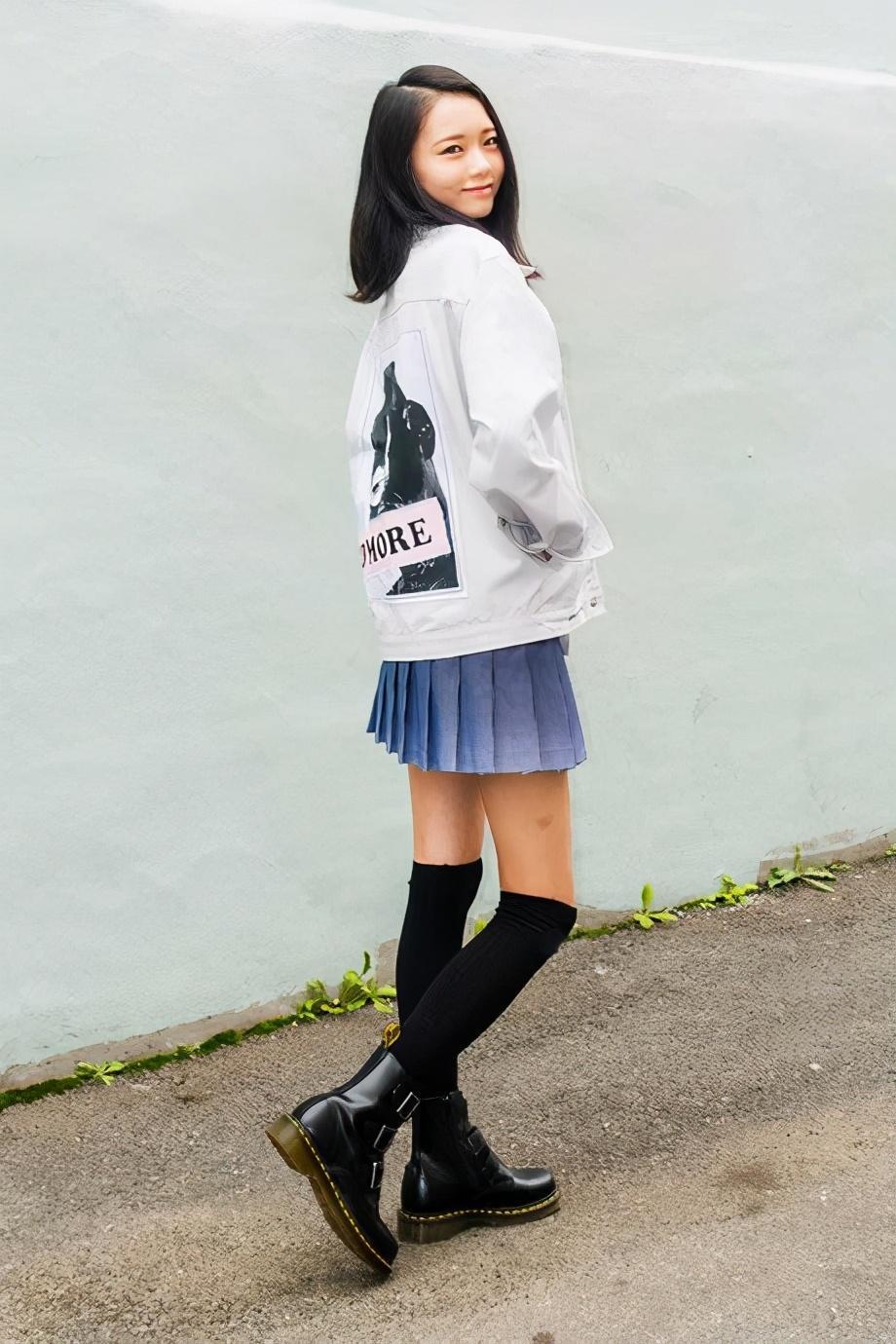 典型的日本风格的短靴搭配膝盖高度的高筒袜,迷你裙