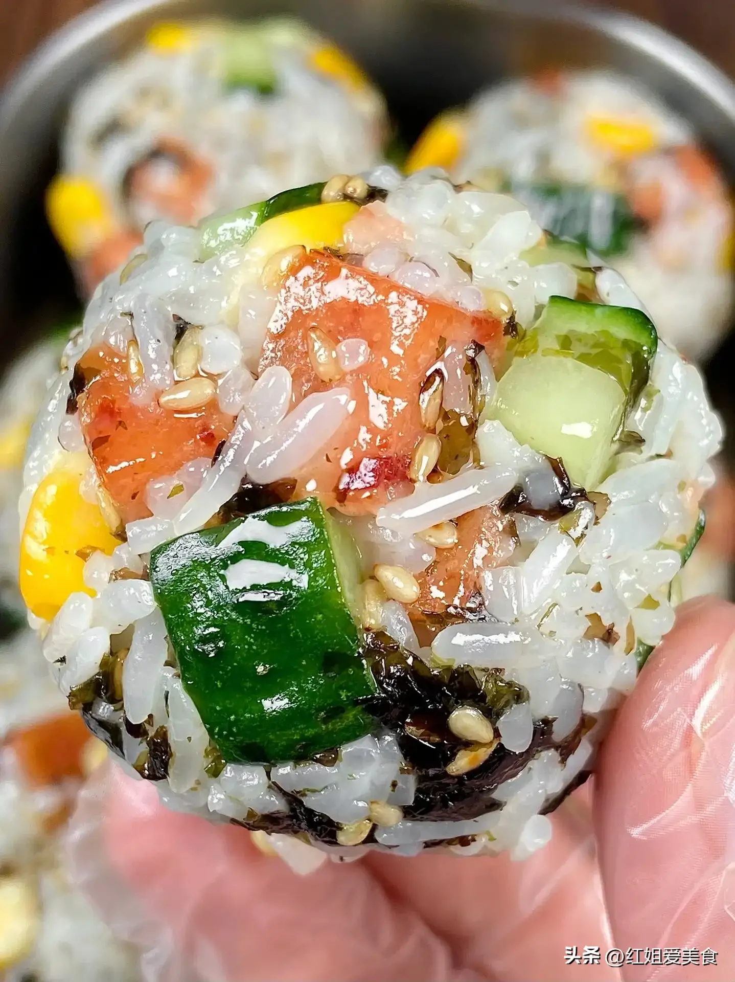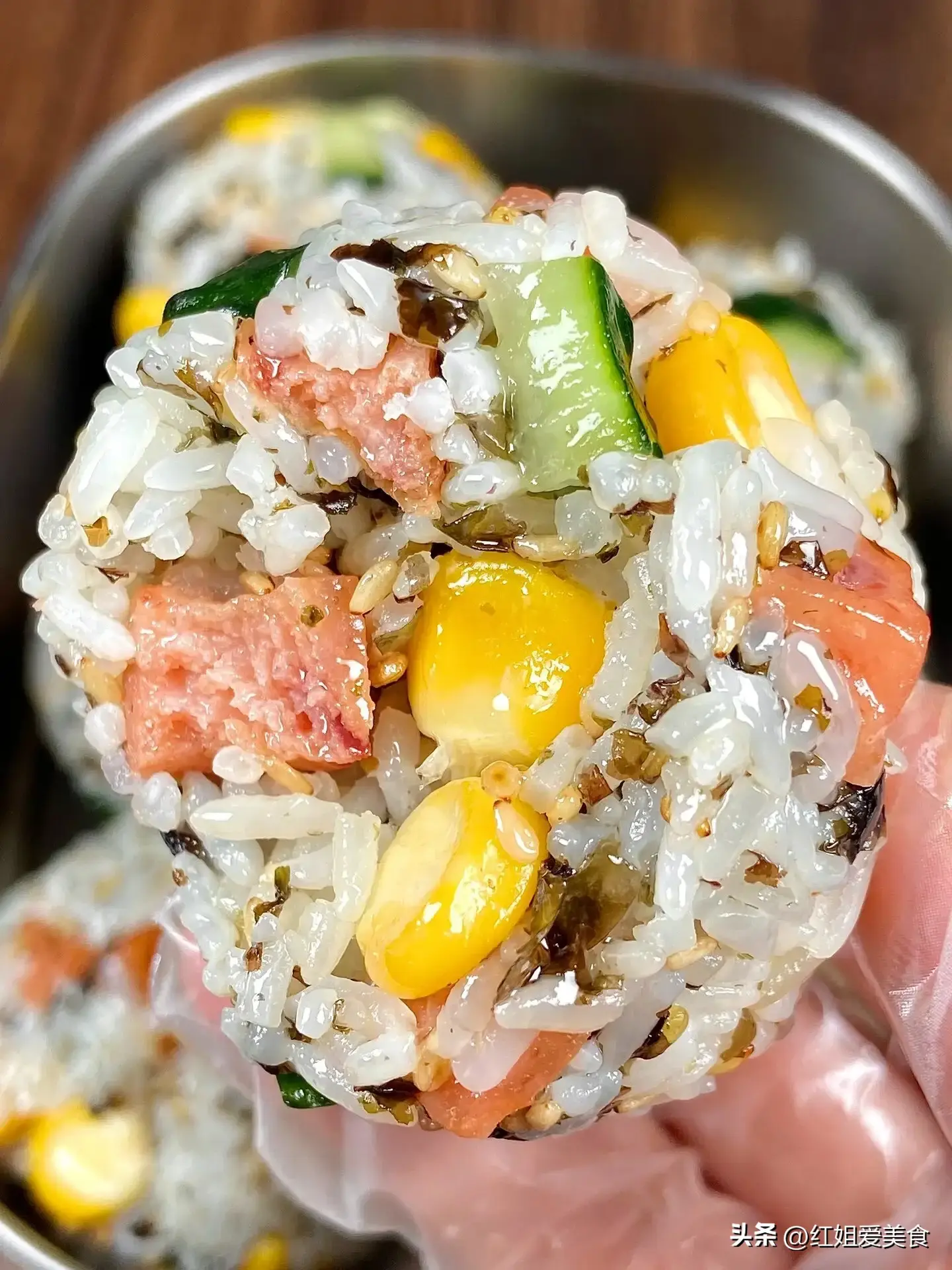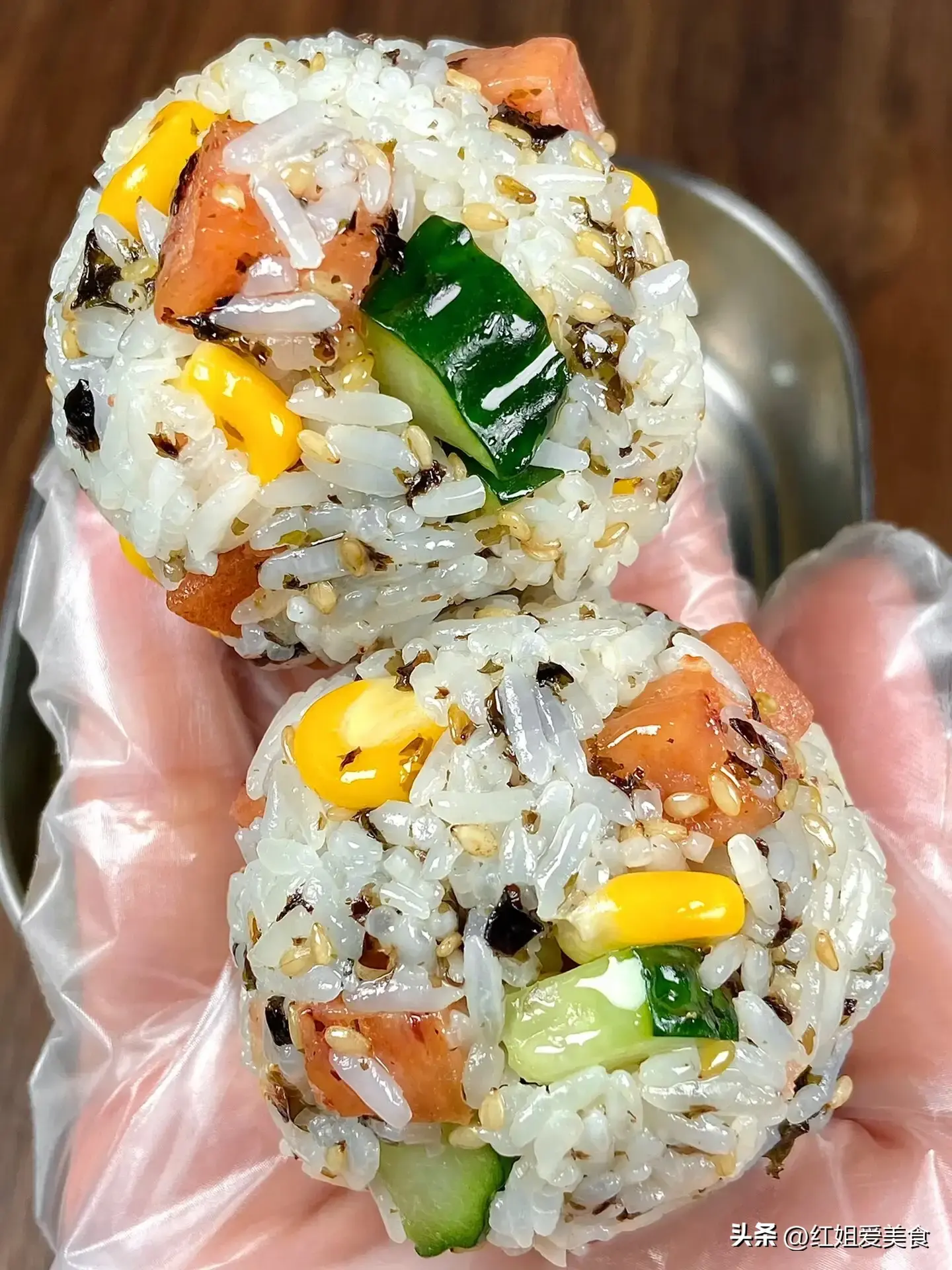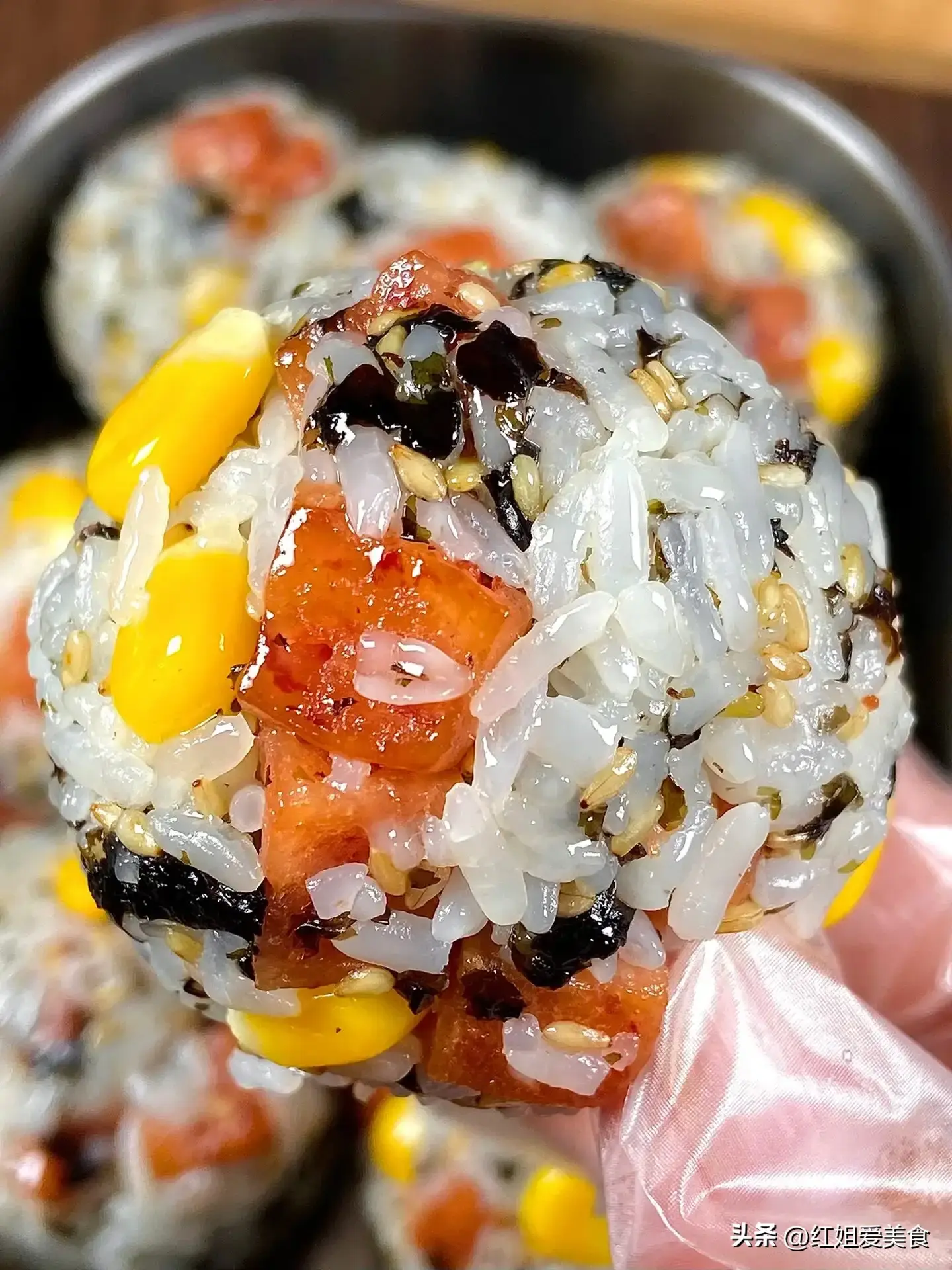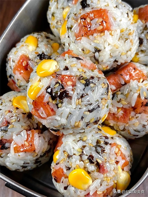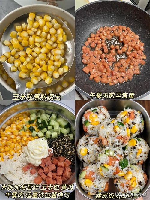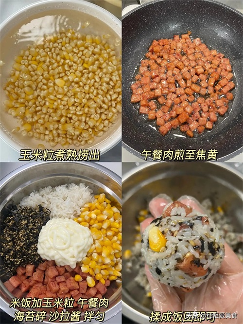 这道菜品将玉米、午餐肉和紫菜相结合,制作成饭团。