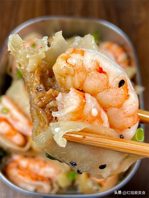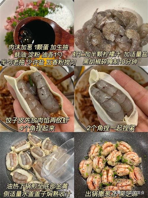 这道菜品以鲜虾为主要食材,搭配面粉制作成锅贴。
