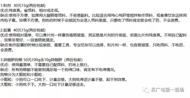 今天上午,记者通过搜索,找到了一名专门售卖异烟肼的网友,对方给出了粉剂、胶囊、异烟肼狗粮三种套餐,每种套餐中还特地标明了针对宠物狗的配料优缺点,并且直接将宠物狗吃下后的效果也标明在其中。
