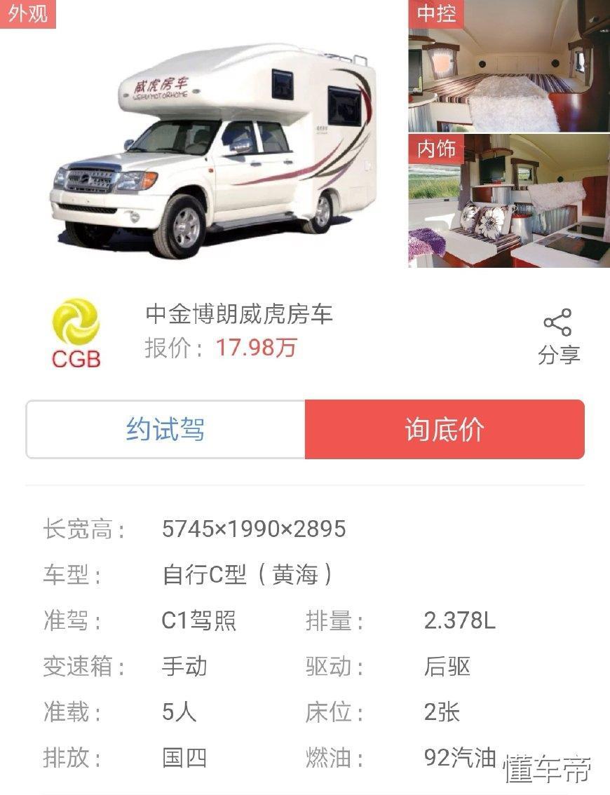 中金博朗威虎房车采用的黄海皮卡为底盘。售价为17.98万元。