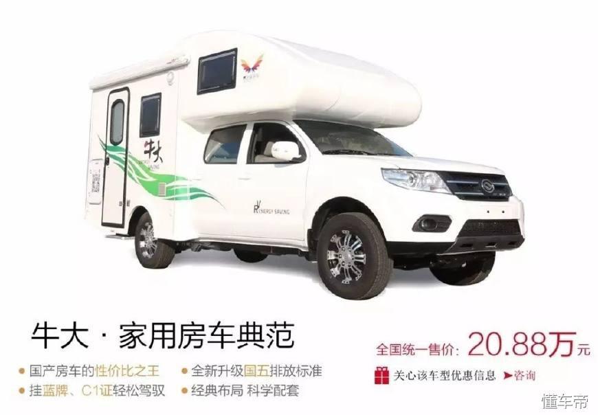 梦之旅的牛大房车是比较早的一代皮卡房车,随着牛二、牛刀等皮卡房车的出现,现在牛大房车售价在20.88万元,采用的是海格皮卡底盘,这款底盘山东巨威也生产了一款巨威牛大房车。