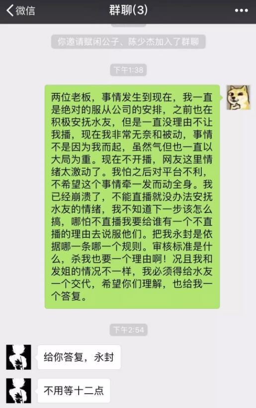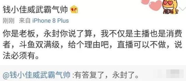 钱小佳使用了全身解数想要斗鱼给自己复播,但是在之后的事件发展可是万万没有想到,一则微信聊天记录疑似斗鱼人员给钱小佳一个“圆满答复”永封。
