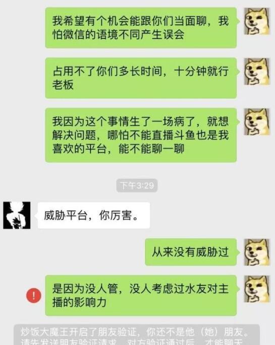 从聊天记录可以看到,这位疑似斗鱼人员在回答了一条消息:“威胁平台,你厉害”之后拉黑了钱小佳的微信。本以为这个事情就此已经算告一段落,之后在10月30日 19:34分钱小佳的微博再次更新了一条动态:“因为前期沟通的问题,导致和平台间存在些误会,目前误会解开了。”